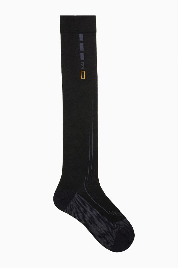 Calzini tecnici RG realizzati con proprietà ipoallergeniche, antibatteriche e traspiranti. Questo modello dal design innovativo con logo RG sul polpaccio, è impreziosito da un intarsio di colore grigio a contrasto sulla pianta.