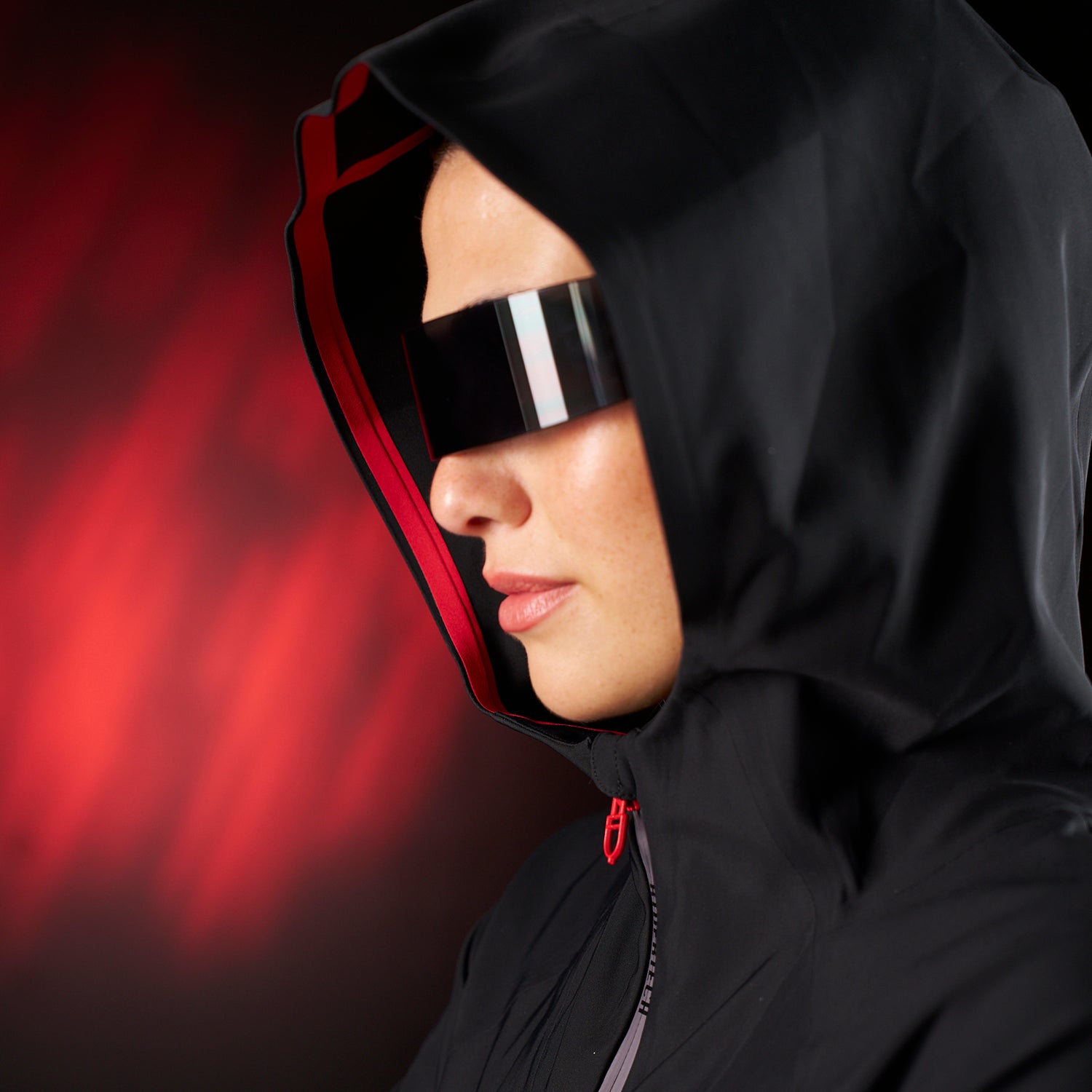 Il cappuccio, dotato di cordino regolabile, garantisce protezione dal vento e dal freddo. Inoltre è dotato di un magnete che si aggancia ad un altro magnete presente sulla parte posteriore della felpa tenendolo stabilmente fermo quando non indossato.
