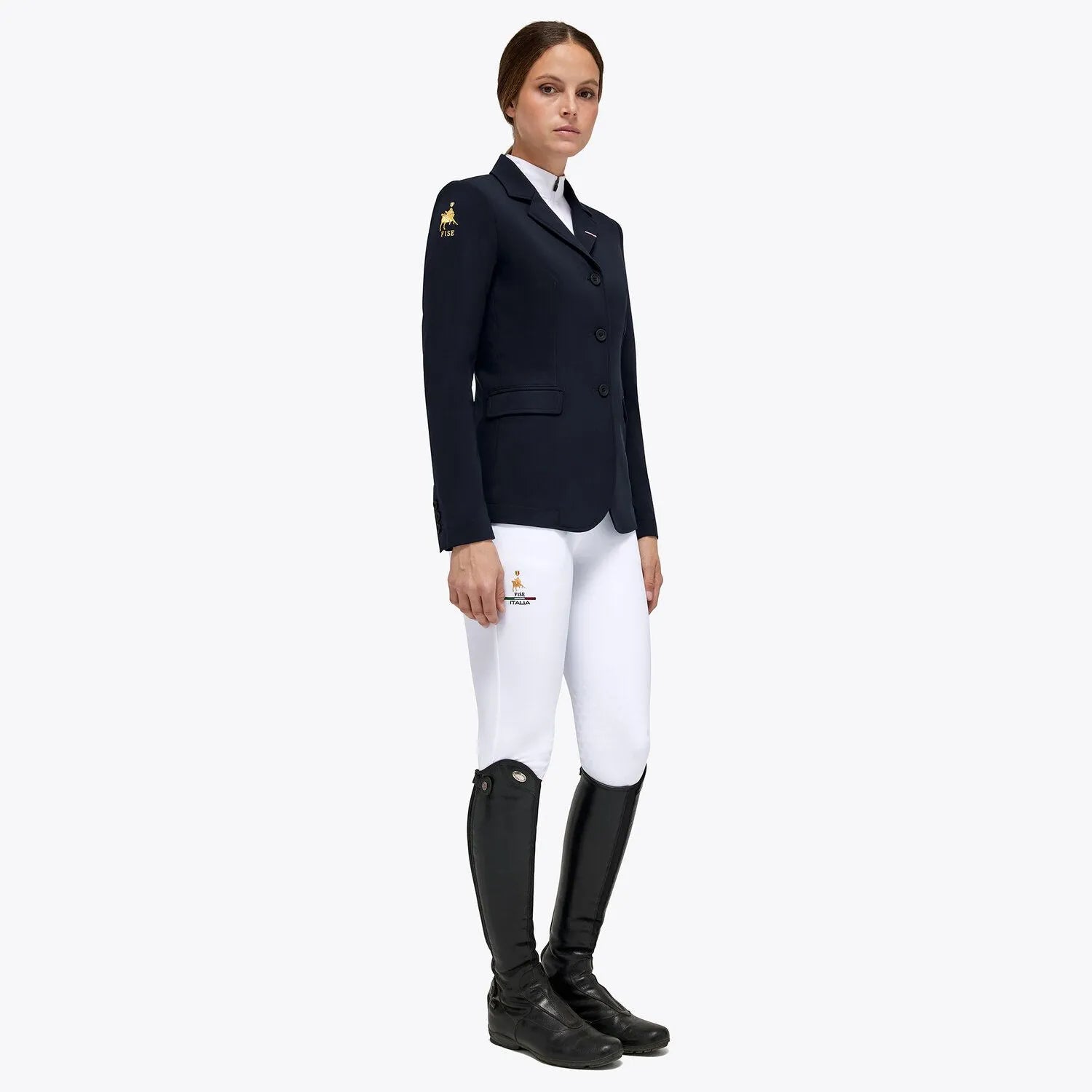 La giacca da donna dal taglio classico e aderente è rifinita da un colletto in alcantara e filetto a contrasto. Il tessuto tecnico bi-stretch è al tempo stesso elegante e altamente performante: favorisce la traspirabilità e segue i movimenti del corpo. E' inoltre idrorepellente e dotato di proprietà antibatteriche. La giacca presenta due tasche laterali ed è chiusa da tre bottoni con logo nella parte anteriore. Sulla spalla è impresso un logo a rilievo.