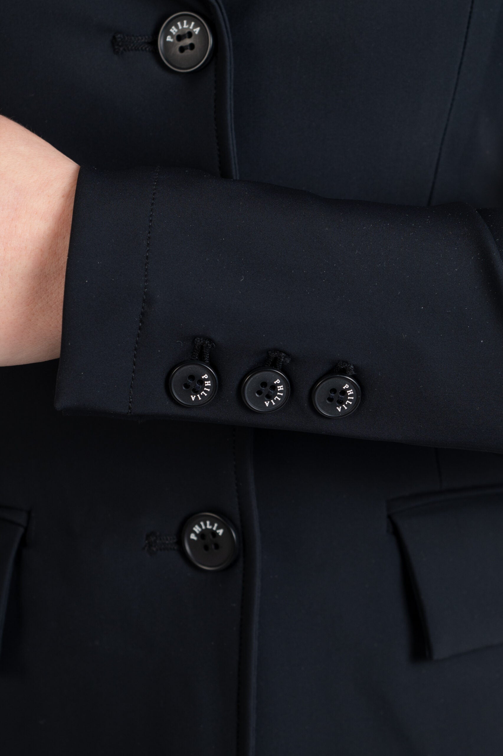 La giacca modello Betta presenta due tasche laterali, chiusura a quattro bottoni brandizzati e ricamo sulla spalla in rilievo.