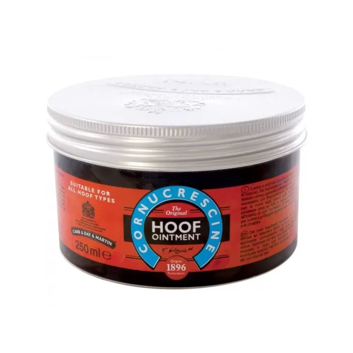 Unguento Zoccoli Cornucrescina Hoof Ointment di Carr&Day&Martin, studiato per mantenere una crescita sana del tessuto corneo e la salute dello zoccolo. Applicarlo settimanalmente o se necessario più frequentemente. Va applicato con la mano come una crema sugli zoccoli, facendolo penetrare bene anche nelle incrinature e sulla banda coronaria. E' adatto inoltre a proteggere e nutrire le parti calve, strofinate oppure le cicatrici.