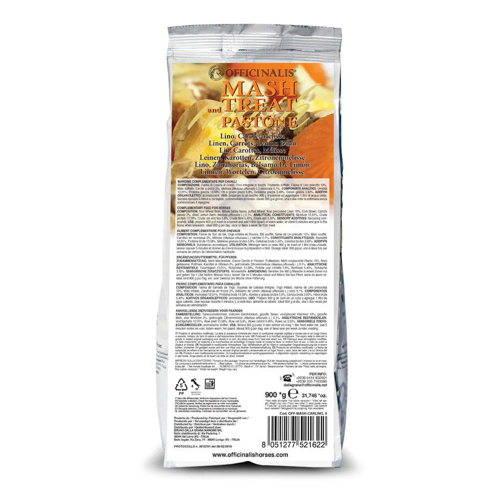 Farina di Crusca di grano, Orzo fiocchi, Frumento soffiato, Farina di Lino precotto (10%), Mais soffiato, Carote a pezzi (2%), Melissa Officinalis (0,1%) Componenti analitici: Umidità 11,27% - Proteina grezza 13,43% - Oli e grassi grezzi 7,26% - Fibra grezza 8,48% - Ceneri grezze 4,82%. PREPARAZIONE: preparare in una bacinella 1 o 1/2 kg di pastone ed aggiungere 1 o 2 litri di acqua molto calda a seconda se si desidera ottenere un pastone più consistente o piu morbido. Lasciare riposare per 5 minuti e somministrare al cavallo, non troppo caldo. ADDITIVI ZOOTECNICI: Stabilizzatori della flora intestinale Lactobacillus acidophilus 600000 ufc/kg. ADDITIVI ORGANOLETTICI: Aromatizzanti.
