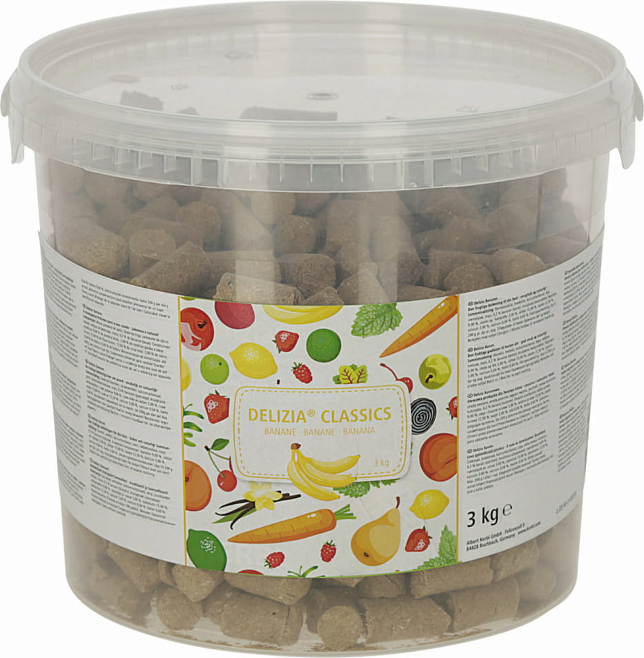 I dolcetti alla banana DELIZIA sono la ricompensa ideale per il tuo cavallo. Sono fatti con ingredienti naturali di alta qualità. Sono sani e ricchi di minerali e vitamine. Così puoi ricompensare il tuo cavallo dopo uno sforzo, durante una sessione di etologia o semplicemente dargli una ricompensa con questi dolcetti alla banana.